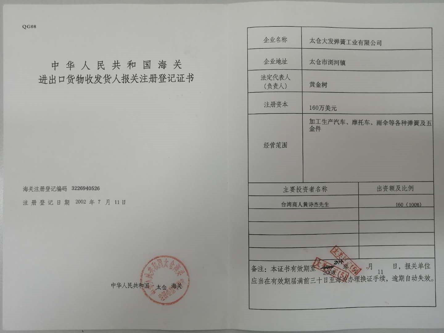 太倉(cāng)大發(fā)彈簧工業(yè)有限公司由黃金樹先生于1967年始創(chuàng)于臺(tái)灣,是一個(gè)集雨傘、電子、五金機(jī)械、自行車、摩托車、汽車等的彈簧配件生產(chǎn)、加工、輔助設(shè)計(jì)服務(wù)的綜合性企業(yè),其中1990年創(chuàng)辦的廈門大發(fā)彈簧公司、2000年創(chuàng)辦的深圳大發(fā)彈簧公司、2002年創(chuàng)辦的太倉(cāng)大發(fā)彈簧公司均位于經(jīng)濟(jì)發(fā)展地區(qū),地理位置佳。我們憑借在彈簧制造業(yè)的多年豐富知識(shí)與技術(shù),并著眼于以客戶為導(dǎo)向,秉持“以人為本,以質(zhì)為先,以客為主,持續(xù)創(chuàng)新”的經(jīng)營(yíng)理念,強(qiáng)化競(jìng)爭(zhēng)優(yōu)勢(shì)。公司導(dǎo)入ISO9001: 2000質(zhì)量管理體系,執(zhí)行ISO14000:2000管理方式,倡導(dǎo)安全、高質(zhì)量、高素質(zhì)的生產(chǎn)。